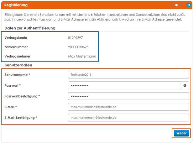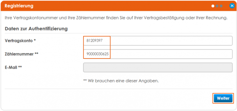Tragen Sie bitte Ihre Vertragskontonummer und die dazugehörige Zählernummer oder Ihre E-Mail-Adresse ein.