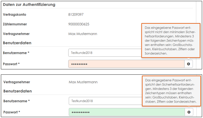 Die Hintergrundfarbe zeigt Ihnen an, ob das hinterlegte Passwort den Sicherheitsanforderungen entspricht.