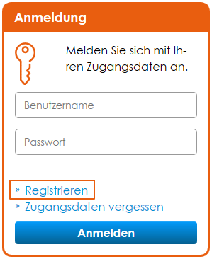 Um sich zu registrieren, klicken Sie bitte in dem Kästchen „Anmeldung“ auf „Registrieren“.