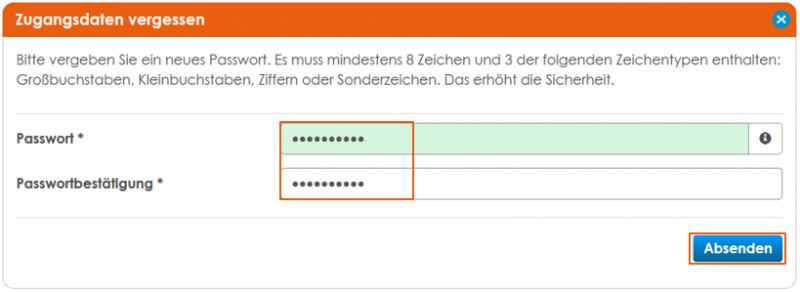 Geben Sie bitte ein neues Passwort sowie die Passwortbestätigung ein.